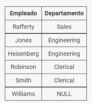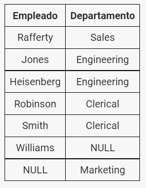 Y si no hay ningún empleado trabajando en un departamento determinado, se mostrará NULL. Pero el departamento aparecerá de igual forma.